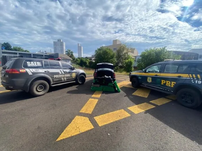 A Polícia Rodoviária Federal (PRF) e o Serviço Aeropolicial de Fronteira (SAER-Fron) interceptaram, na manhã desta quinta-feira (30), em Chapecó, um automóvel carregado com drogas. A ação conjunta resultou na apreensão de 221 kg de maconha, 1,5 kg de haxixe e 250 g de skunk.