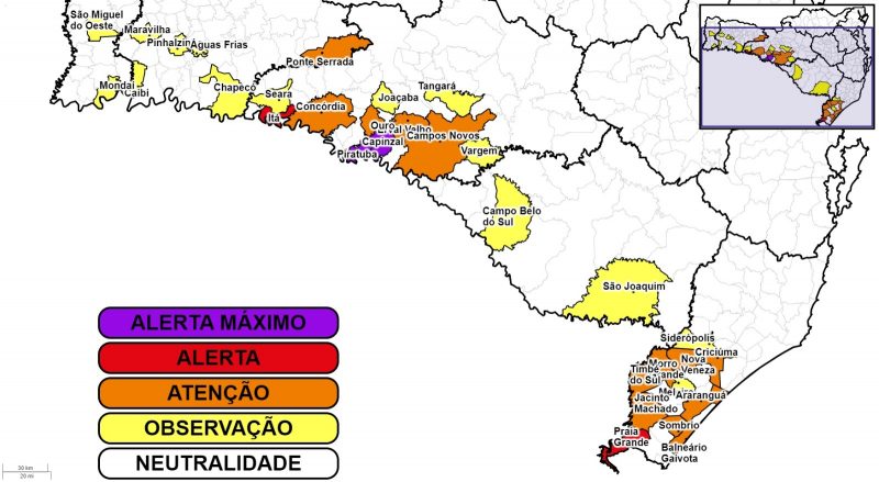 Conforme a Defesa Civil, nas últimas 24h, Piratuba teve o maior acumulado do Estado com 202,6 mm de chuva. O município de Capinzal, nas últimas 24h, registrou 201,2 mm.