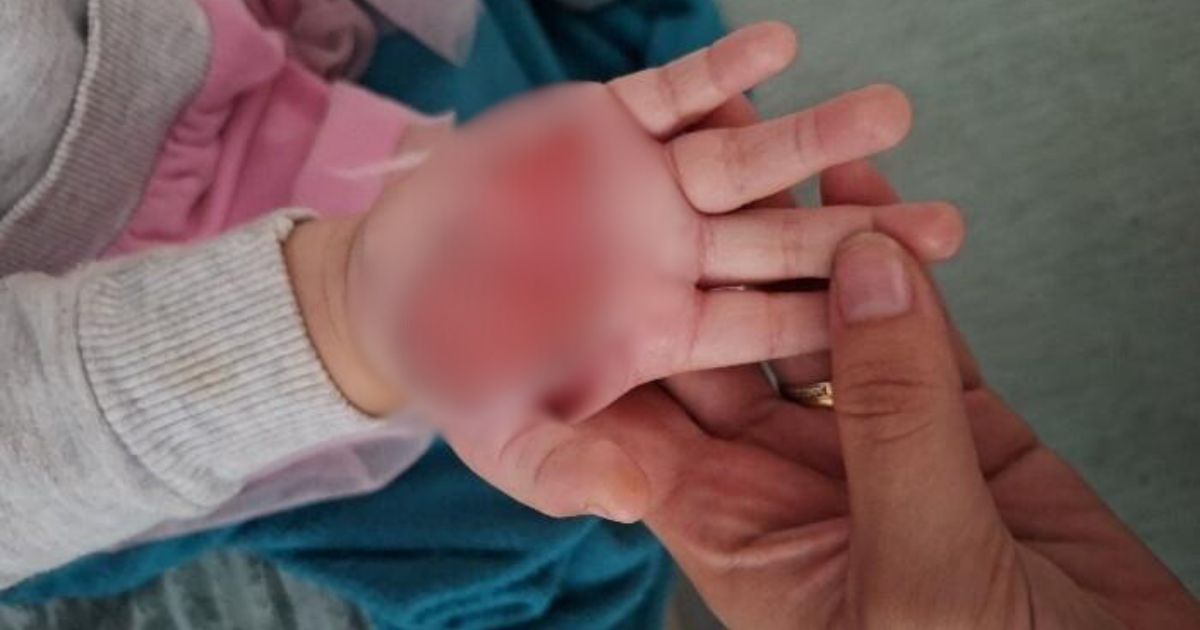 Criança de 2 anos que teve a mão queimada pela madrasta em Itajaí no último domingo (26); ela chegou a ser encaminhada a hospital em Florianópolis