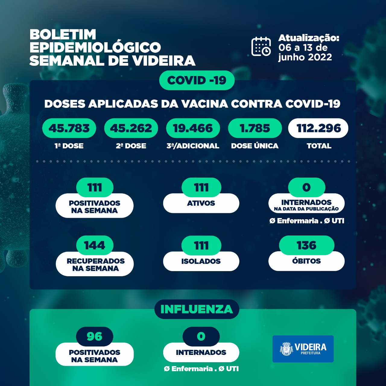 Segundo boletim divulgado semanalmente foram 111 positivados nesta semana anterior. Situação diferente das 144 da semana retrasada. O novo boletim também mostra que não há pessoas internadas, e 144 recuperados na semana.