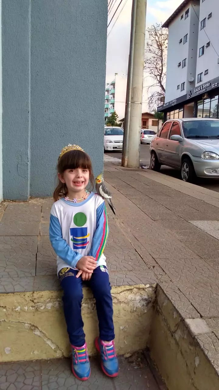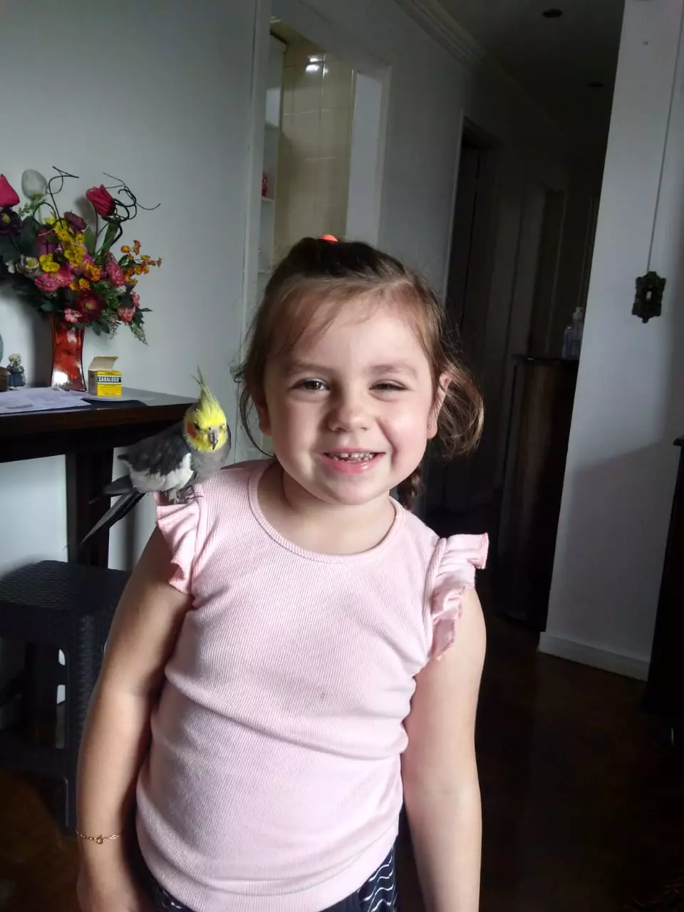 A calopsita fazia parte de vários momentos do dia a dia da família. Ia junto ao supermercado, farmácia, entre outros passeios rotineiros, sempre no ombro.