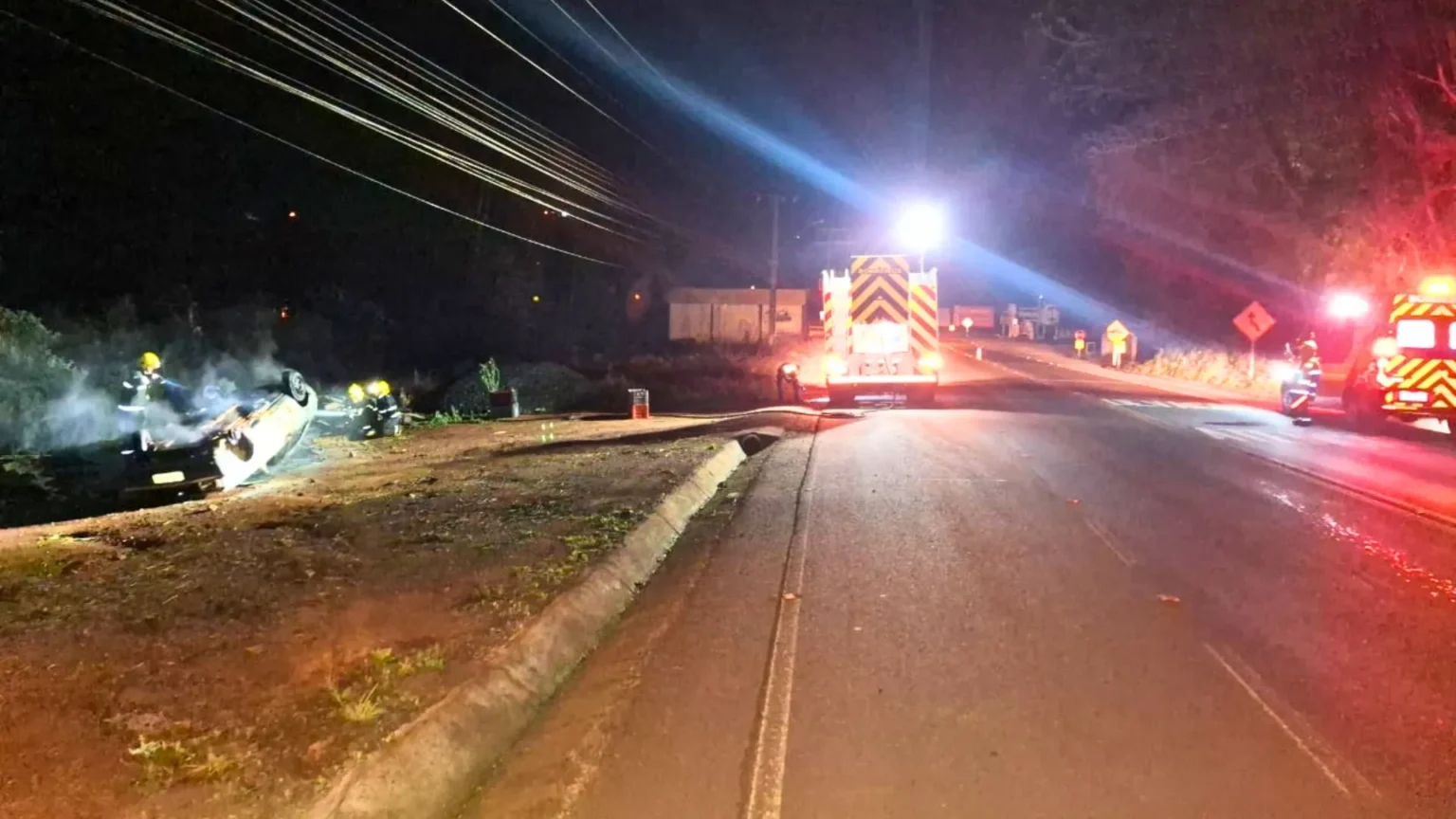 O Corpo de Bombeiros Militar de Tangará foi acionado para atendimento próximo à entrada da Vila Bressan. No local, constataram que o veículo havia saído da pista, capotado e incendiado.