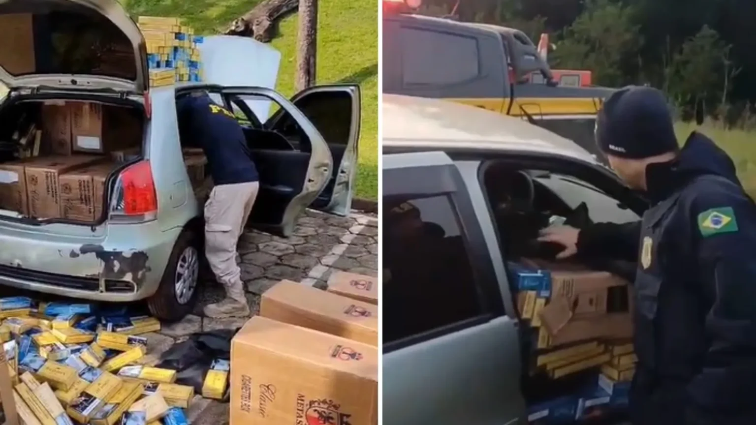 No interior do carro, os agentes encontraram caixas de cigarros do Paraguai escondidas no porta-malas, no banco traseiro e até no banco do passageiro, todas cobertas por um tecido preto.