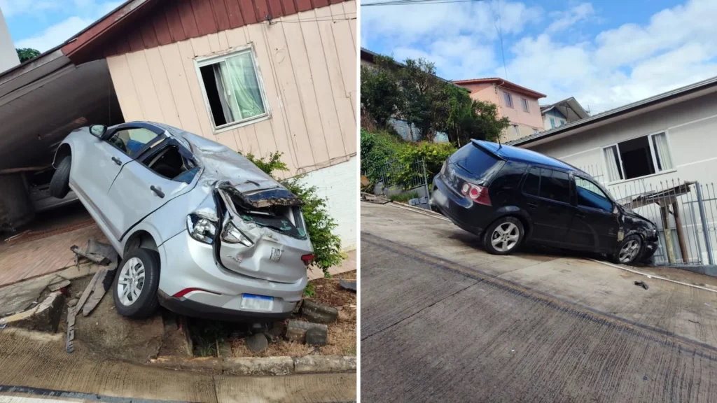 Um incidente chamou atenção no bairro São Cristóvão, em Videira, na manhã desta quarta-feira (8). Um Volkswagen Golf, que estava estacionado na rua Vigário Lourenço, desceu desgovernado a via, que possui grande inclinação, e acabou atingindo outro carro, um Fiat Argo, que estava estacionado em uma garagem. O veículo só parou após colidir com a grade de proteção de uma residência próxima.