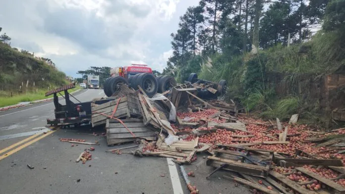 O incidente envolveu um caminhão Ford Cargo com placa de Videira, que seguia no sentido de Bom Jardim da Serra para São Joaquim e acabou perdendo o controle em uma curva