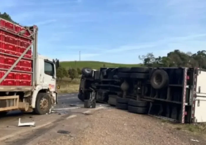 Caminhão tomba após colidir com caminhão de transporte de galinhas