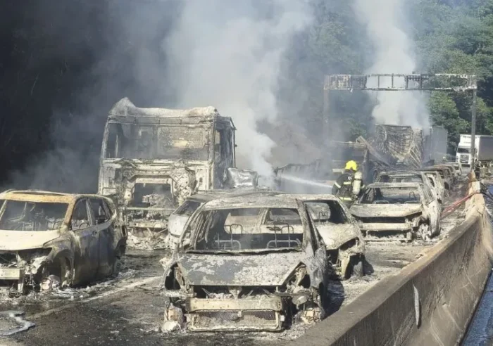 Ao menos 25 veículos pegam fogo após carreta explodir na BR-101