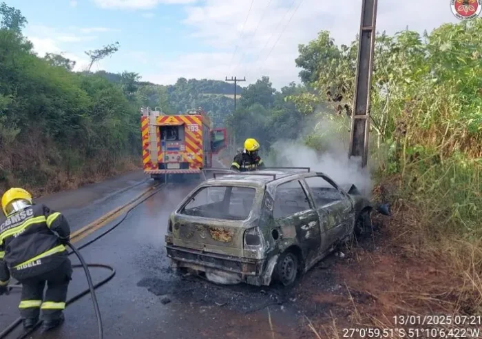 Carro bate em poste e pega fogo
