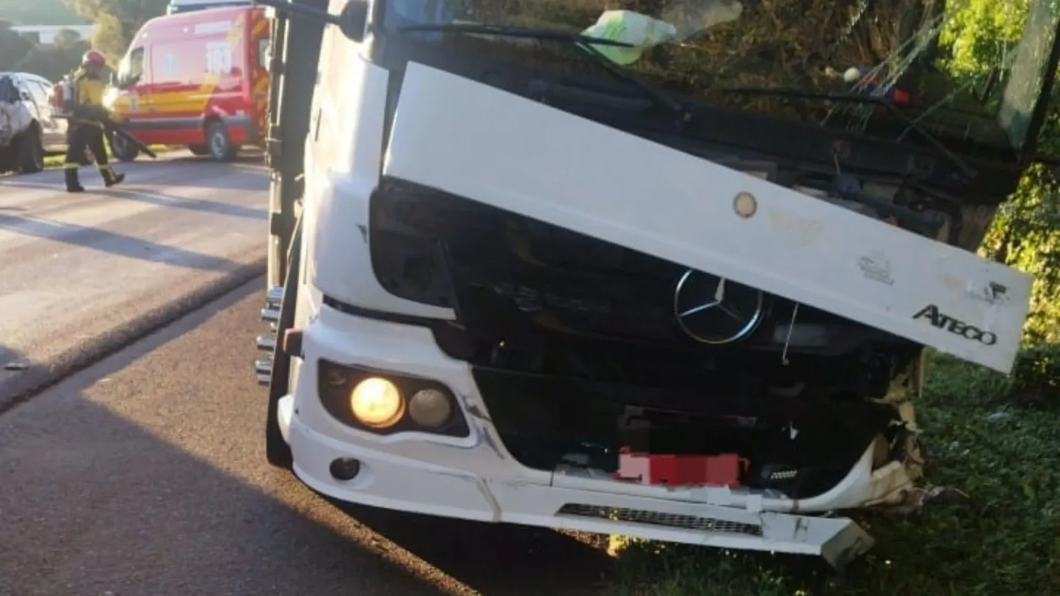 Apesar do impacto, a situação não resultou em vítimas graves. O motorista do caminhão recebeu atendimento pré-hospitalar ainda no local, apresentando dores na região abdominal.