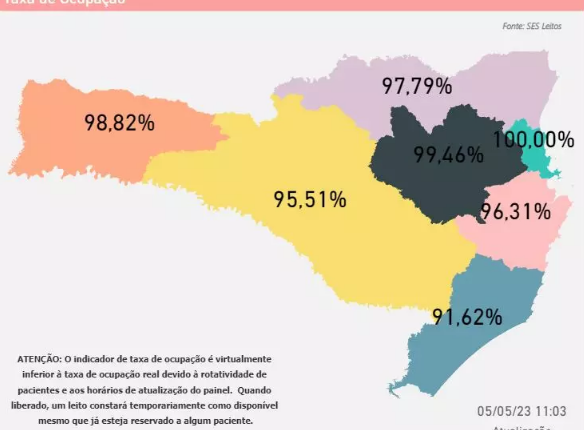 A região com a maior ocupação do Estado é Foz do Rio Itajaí, que está com 100% de ocupação, ou seja, sem nenhum leito disponível. Em seguida vem Vale do Itajaí com 99,46% e Grande Oeste com 98,82%.