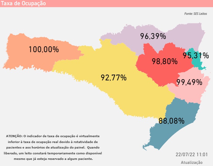 Ainda de acordo com o painel, a taxa de ocupação dos leitos de UTI pediátricos em Santa Catarina é de 95,7%. Há cinco leitos disponíveis dos 117 ativos. As regiões Grande Florianópolis, Grande Oeste, Sul e Vale do Itajaí atingiram a lotação máxima para esse tipo de leito.