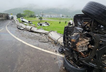Oito carros foram danificados após caminhão-cegonha tombar na divisa entre SC e RS