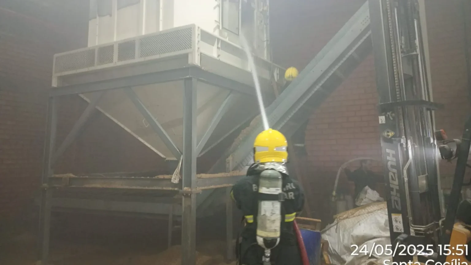 O foco do incêndio estava concentrado na máquina resfriadora de pallets, um equipamento utilizado para resfriar materiais após o processo de paletização.