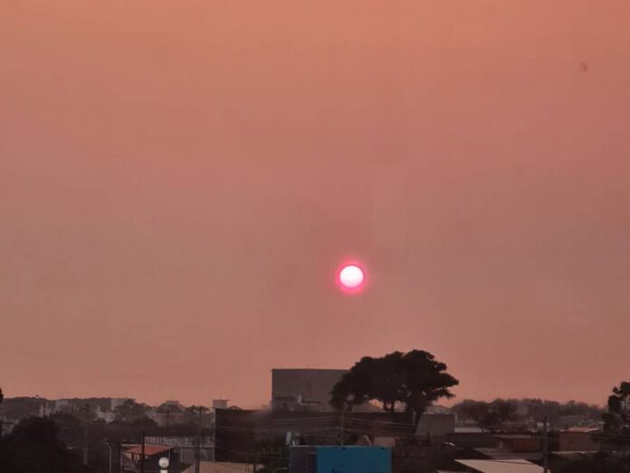 A densa camada de fumaça está cobrindo o céu, tornando o ar difícil de respirar e escurecendo o céu.
