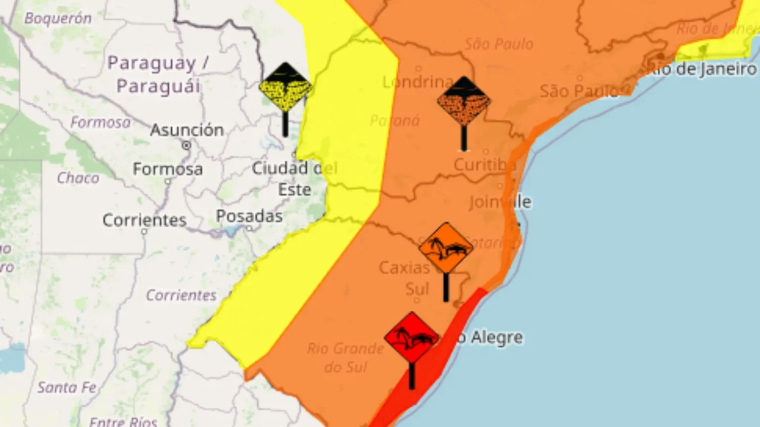 Já o alerta amarelo cobre a região Oeste do estado, válido até às 23h59 desta terça-feira. O aviso também inclui áreas do Rio Grande do Sul, Paraná, Mato Grosso do Sul e São Paulo.