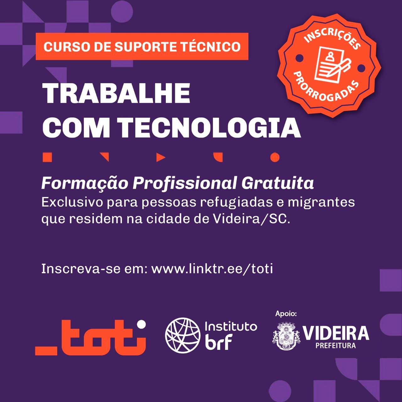 Foram prorrogadas as inscrições para o curso profissionalizante em Suporte Técnico, oferecido pelo Instituto BRF, através da Toti Diversidade, em parceria com a Prefeitura de Videira, por meio da Central do Imigrante.
