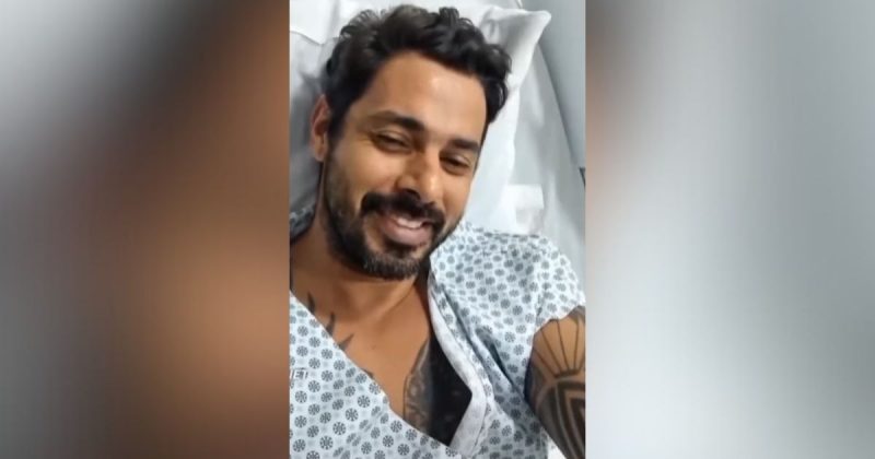 “Se eu empacotar (risos), eu não quero saber dessa roupinha aqui não. Não combinou muito comigo isso aqui não, é de florzinha”, disse o cantor enquanto conversava com a esposa Francine Caroline, no leito pré-cirúrgico.