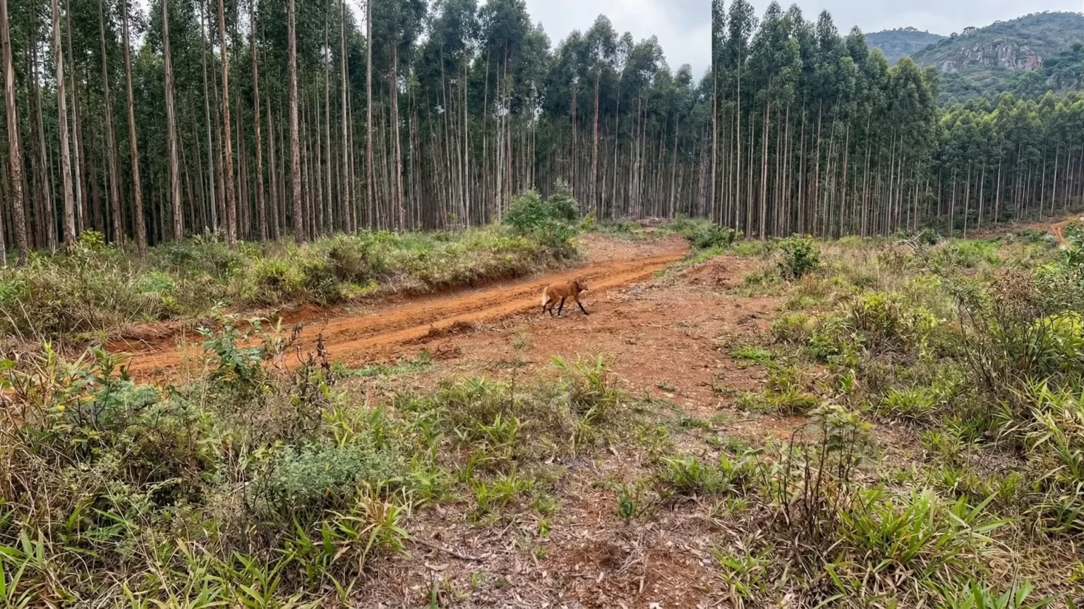 Um Lobo-guará foi flagrado cruzando uma área de reflorestamento no município de Calmon, no Meio-Oeste de Santa Catarina. O registro foi feito na quarta-feira, 11 de março de 2026, por um funcionário de uma empresa do setor florestal e mostra a tranquilidade com que o animal atravessa o local.