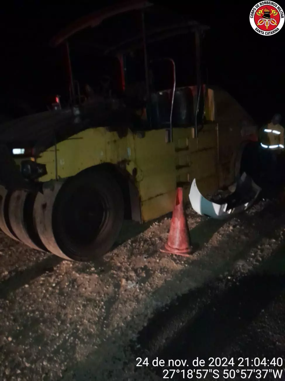 Um segurança que trabalha em uma obra próxima ao local relatou às autoridades que o motorista perdeu o controle ao fazer uma curva, quando atingiu a máquina parada no acostamento.