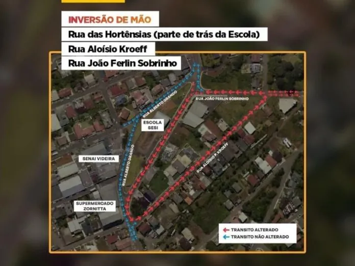 Em virtude do aumento significativo do fluxo de veículos no entorno da nova escola Sesi, no Bairro São Cristóvão, a Prefeitura de Videira, por meio do ORTRAVI, com apoio da Secretaria de Desenvolvimento Urbano (SDU) realizam neste domingo (15), a partir das 07h30 a inversão de mão em três ruas do entorno, para melhorar o tráfego.