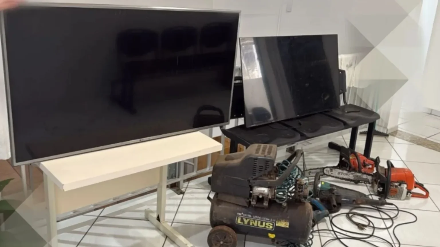 Entre os itens recuperados estão compressor de ar, motosserras, televisores e esmerilhadeiras