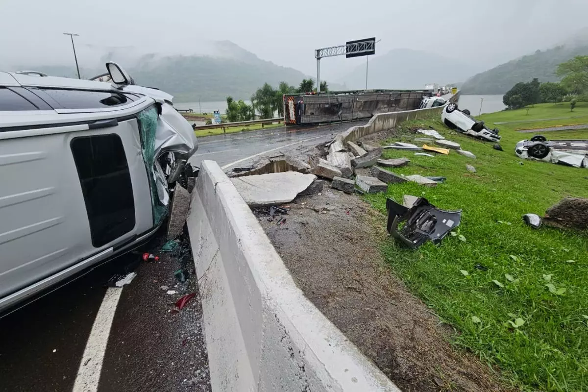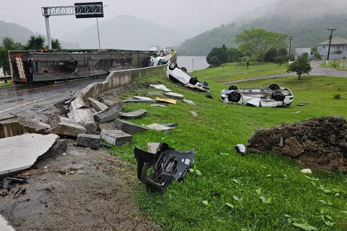 Conforme apurado pelo repórter do Balanço Geral, Marcos Lewe, no local do acidente, quatro carros caíram do caminhão-cegonha e ficaram espalhados às margens da rodovia. Outros quatro carros ficaram presos no caminhão, mas também foram danificados. Nas imagens é possível ver que alguns foram destruídos.