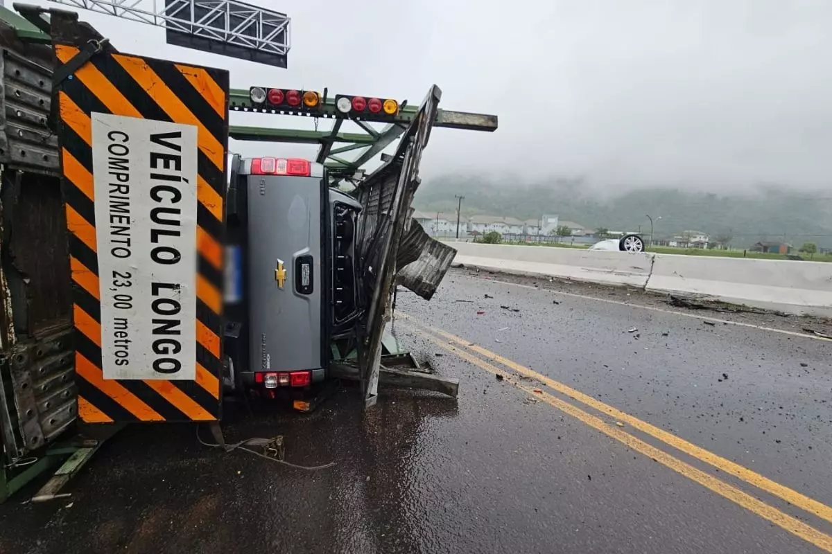 O motorista do caminhão-cegonha, de 36 anos, não teve ferimentos; o trânsito está bloqueado na rodovia e a previsão de liberação é a partir das 15h