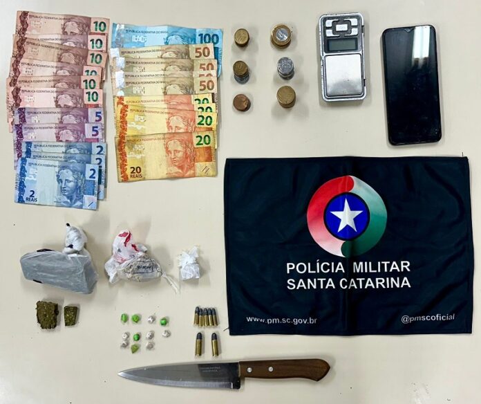 No local da abordagem, foram encontrados maconha, crack, apetrechos utilizados no tráfico, uma quantia em dinheiro e munições intactas.