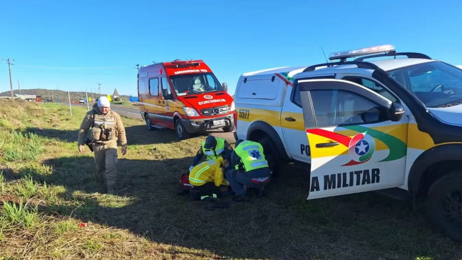 Após o acidente, o Corpo de Bombeiros Militar prestou atendimento no local. A vítima apresentava suspeita de fraturas no ombro e joelho esquerdos.