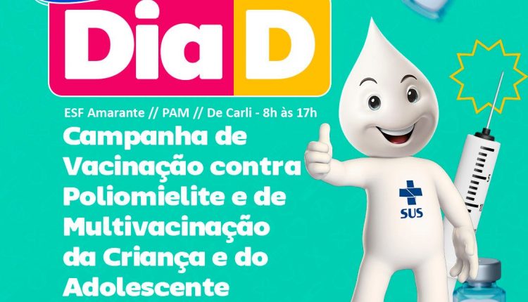 A Campanha Nacional de Vacinação Contra a Poliomielite e de Multivacinação para crianças e adolescentes de 0 a 14 anos está em andamento, e neste sábado (20), das 8h às 17h, a Sala de Vacinas do Pam e as ESF’s dos bairros Amarante e De Carli estarão abertas para a vacinação.