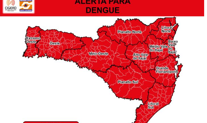 Santa Catarina está em alerta vermelho por conta da dengue. A Defesa Civil Estadual emitiu um alerta no sábado (11) que classifica o estado com risco muito alto para a doença. De acordo com o último levantamento divulgado pela Dive (Diretoria de Vigilância Epidemiológica), até 4 de março, já haviam sido confirmados mais de 1,3 mil casos da doença no território catarinense.