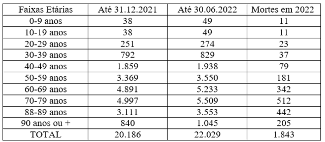 Inicialmente, é possível verificar que as mortes derivadas da Covid-19 nas faixas etárias jovens, até os 40 anos, são inferiores a 5% do total documentado no primeiro semestre de 2022. Contudo, isso não quer dizer que elas não estejam ocorrendo neste grupo de pessoas.