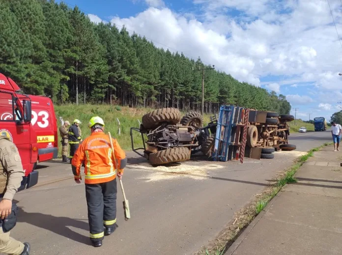 De acordo com os Bombeiros Voluntários, o caminhão tombou e o trator que estava em cima ao cair da carroceria acabou atingindo um ônibus de transporte coletivo que passava no momento.