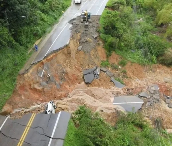 Neste ponto, há uma galeria pluvial sob a rodovia, que não apresenta danos. Portanto, não há risco de que a pista ceda, informou o Dnit.