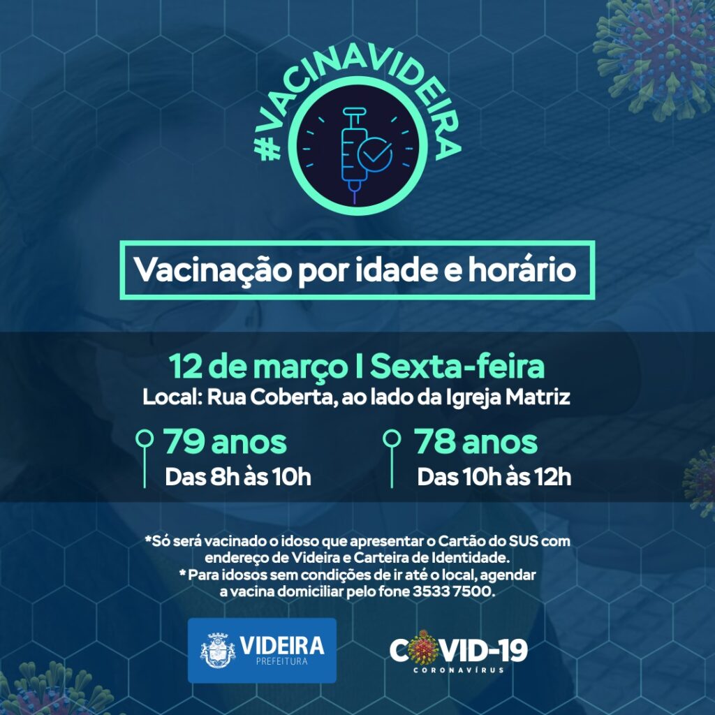 A Secretaria de Saúde de Videira informa que receberá mais doses da vacina, para a imunização dos idosos, com a seguinte programação: