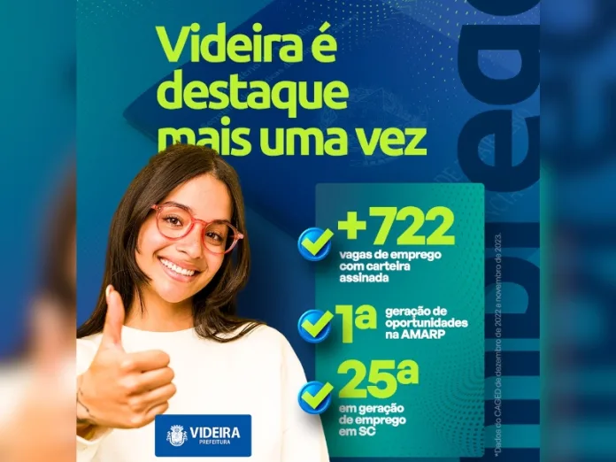Videira aparece como destaque positivo no relatório de classificação dos municípios brasileiros na criação de vagas de emprego com carteira assinada do CAGED – Cadastro Geral de Empregados e Desempregados, entre o período de dezembro de 2022 e novembro de 2023.