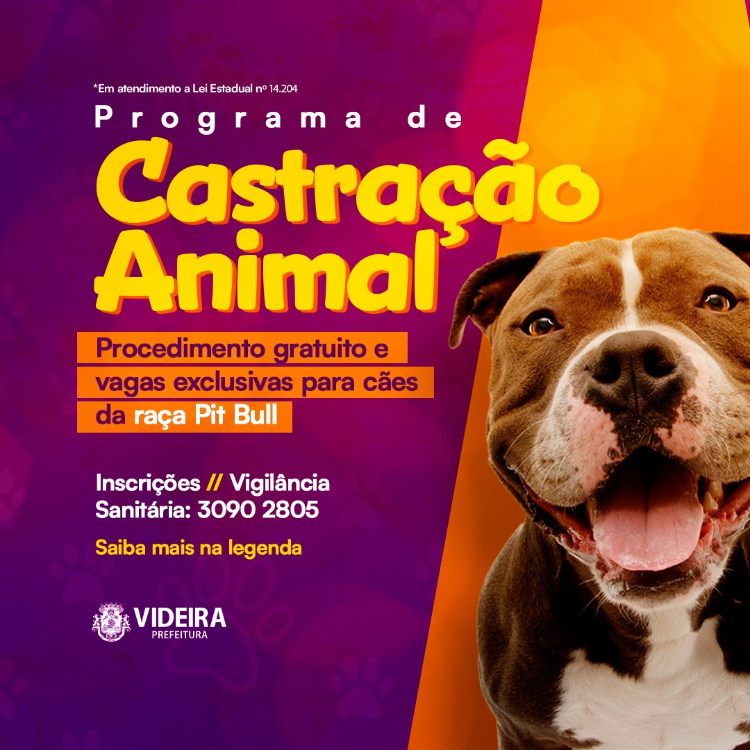 Em cumprimento a essa legislação, o município está disponibilizando vagas para castração gratuita desses animais a partir dos seis meses de idade.