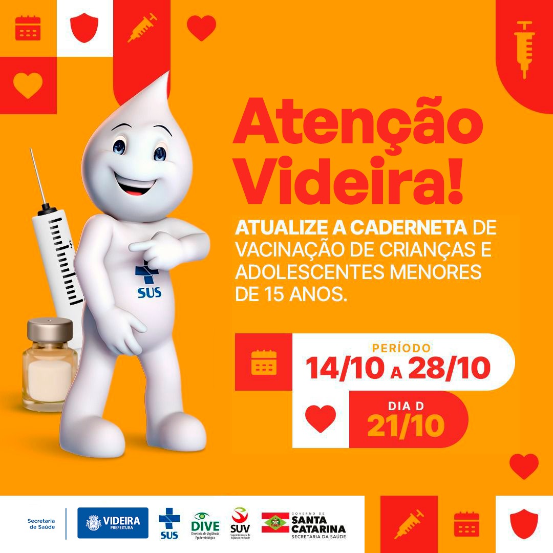 De 14 a 28 de outubro, acontece a Campanha Nacional de Multivacinação para Criança e Adolescente de 0 a 15 anos. Em Videira, as vacinações acontecem de segunda a sexta-feira, das 8h às 17h, na Sala de Vacinas do PAM, em cima do Mercado do Povo, e nas Unidades de Saúde dos bairros Amarante e De Carli.