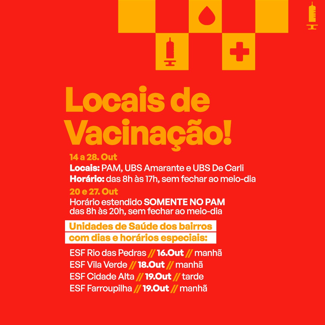Também haverá outras três oportunidades de horários estendidos, sendo: no PAM, dias 20 e 27 de outubro, das 8h às 20h, sem fechar ao meio-dia, e no dia 21, o Sábado D da Multivacinação, das 8h às 17h, no PAM e UBS’s De Carli e Amarante.