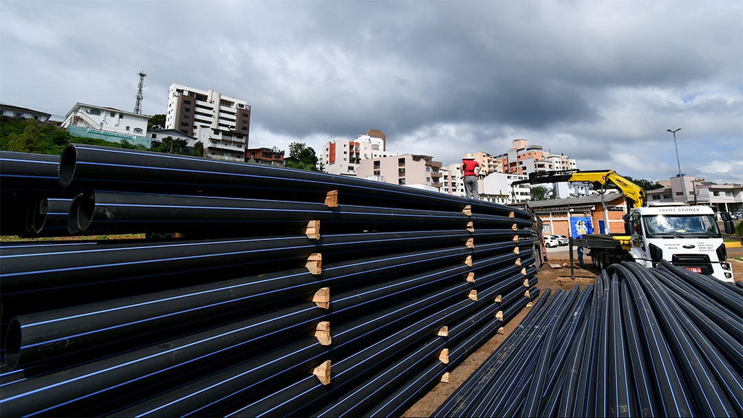 Nesta quinta-feira (25), chegou a primeira parte do material que será utilizado para instalações e substituições de aproximadamente 14 km de novas adutoras e redes de distribuição na cidade, durante este ano.